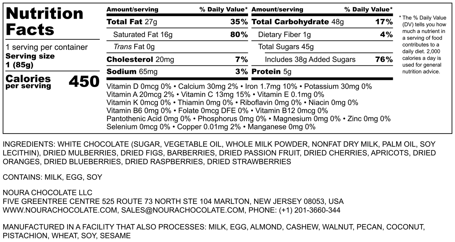 White Chocolate (Sugar, Vegetable Oil, Whole Milk Powder, Nonfat Dry Milk, Palm Oil, Soy Lecithin), Dried Mulberries, Dried Figs, Barberries, Dried Passion Fruit, Dried Cherries, Apricots, Dried Oranges, Dried Blueberries, Dried Raspberries, Dried Strawberries