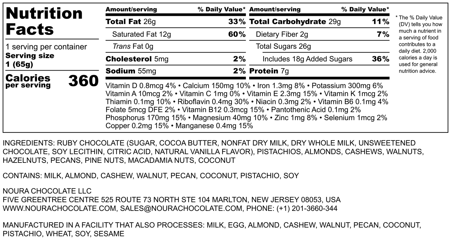 Ingredients: Ruby Chocolate (Sugar, Cocoa Butter, Nonfat Dry Milk, Dry Whole Milk, Unsweetened Chocolate, Soy Lecithin, Citric Acid, Natural Vanilla Flavor), Pistachios, Almonds, Cashews, Walnuts, Hazelnuts, Pecans, Pine Nuts, Macadamia Nuts, Coconut
